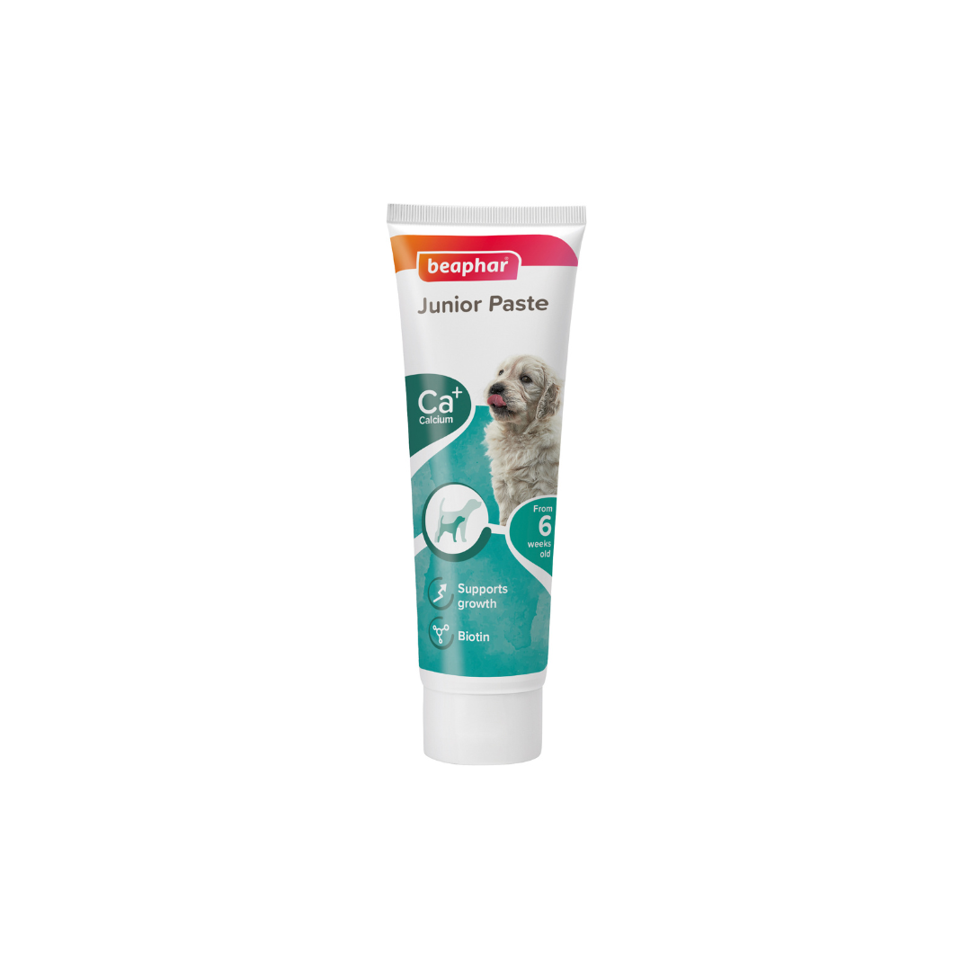 A Beaphar Junior Paste multivitamin-paszta két funkciót ötvöz egy tubusban. A sárga multivitaminos komponens tartalmazza mindazon vitaminokat, melyek szükségesek egy fejlődő kiskutya szervezete számára, hogy egészséges felnőtt kutya válhasson belőle. A fehér kalciumos csík tejből származó kalciumot és azokat a létfontosságú ásványi anyagokat tartalmazza, melyek az erős csontozat, fogak és izmok felépítését támogatják.