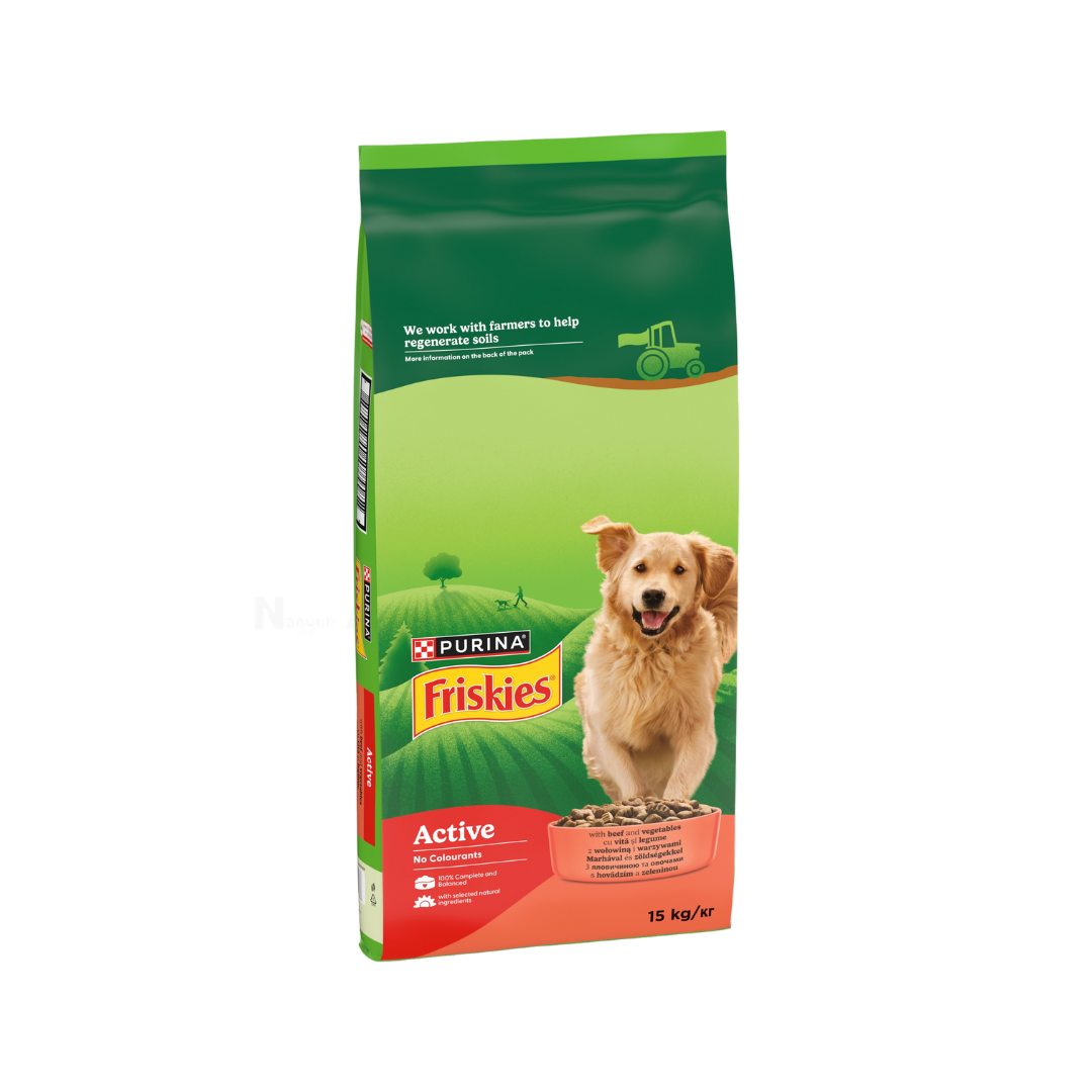Purina® Friskies® Vitafit™ Active ízletes receptúrája marhával, teljes kiőrlésű gabonával, B-vitaminokkal és Omega-3 és -6 zsírsavakkal.