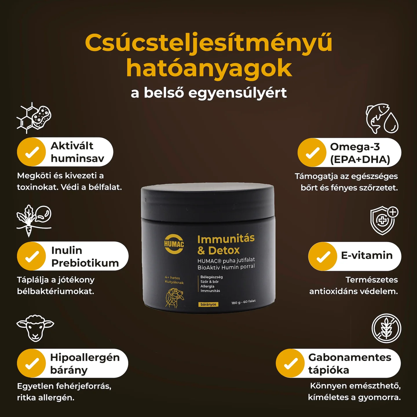 Egyetlen falatban egyesíti a HUMAC® aktivált huminsav‑komplex méregtelenítő erejét az Omega-3 zsírsavak gyulladáscsökkentő hatásával és a prebiotikumok mikrobiom-támogató tulajdonságaival. Hipoallergén formula bárányhússal, gabonamentes, hidegen sajtolt – egészségesebb bőrért, stabilabb emésztésért és erősebb védekezőképességért.