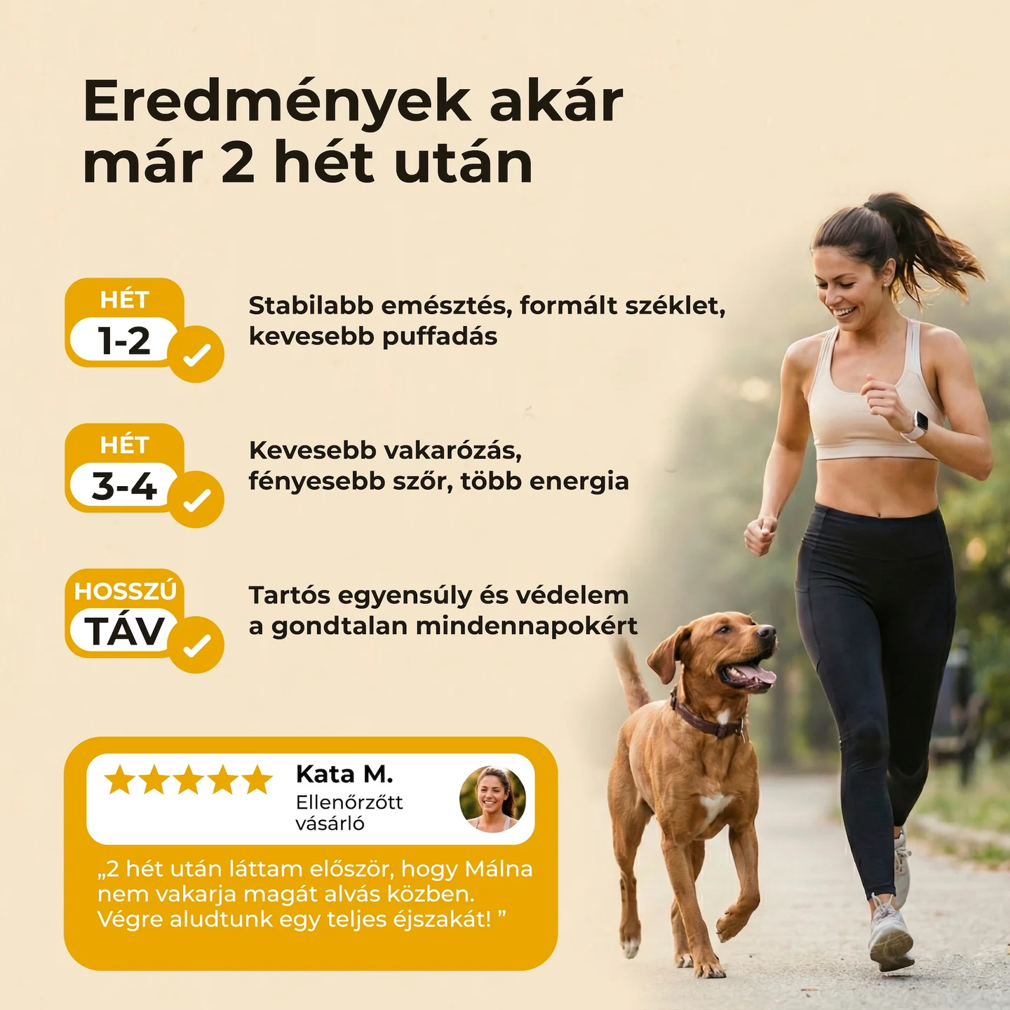 A napi falatokban található huminsav stabilizálja a bélflóra működését, enyhíti a terhelő gyulladásos folyamatokat, és elősegíti a természetes méregtelenítést — ez pedig kedvezően hat a bőr komfortérzetére, a szőr állapotára és a kutya általános vitalitására is.